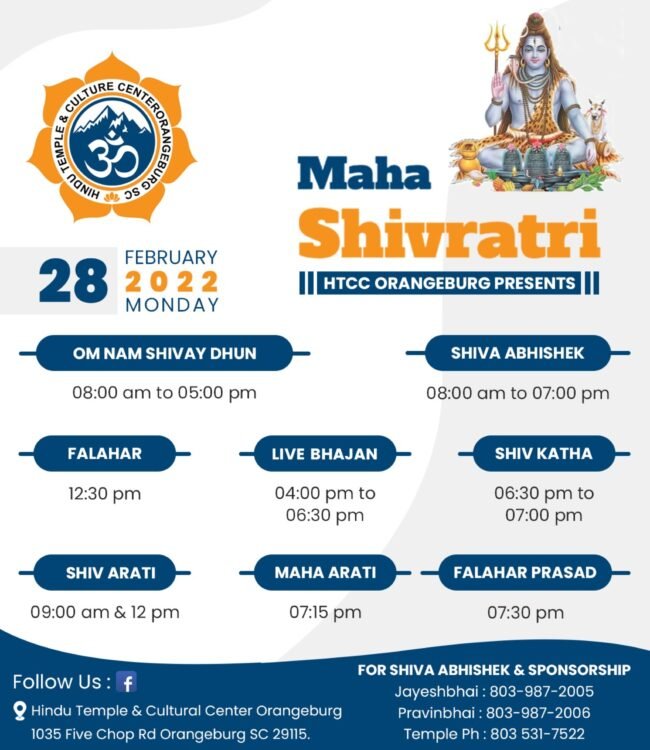 HTCC દ્વારા મહા શિવરાત્રી ની હાર્દિક શુભકામના. શિવ કથા, શિવ અભિષેક, ભજન અને આરતી માં જોડાવા સંપર્ક કરો. If any enquiry and sponsorship Contact:Jayeshbhai: 803-987-2005Pravinbhai: 803-987-2006Temple Ph: 803-531-7522