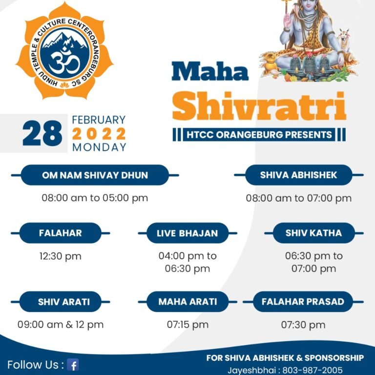 HTCC દ્વારા મહા શિવરાત્રી ની હાર્દિક શુભકામના. શિવ કથા, શિવ અભિષેક, ભજન અને આરતી માં જોડાવા સંપર્ક કરો. If any enquiry and sponsorship Contact:Jayeshbhai: 803-987-2005Pravinbhai: 803-987-2006Temple Ph: 803-531-7522