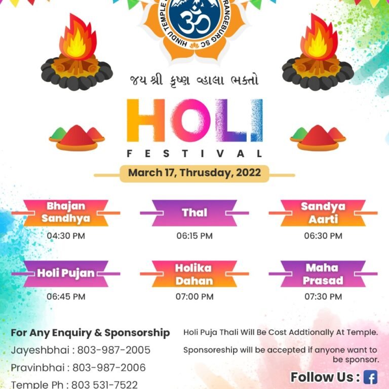 HTCC સાથે રંગો ના તહેવાર હોળી ને મનાવો. હોલિકા દહન અને પૂજન સાથે મહા પ્રસાદ. If any enquiry and sponsorship Contact:Jayeshbhai: 803-987-2005Pravinbhai: 803-987-2006Temple Ph: 803-531-7522
