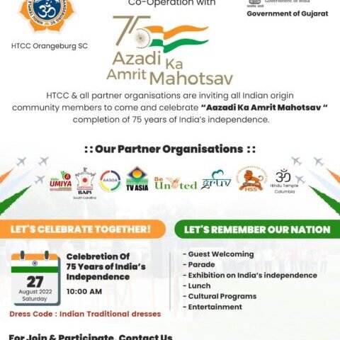 Let’s Celebrate together Azadi ka Amrit Mahotsav. Celebration of 75 years of India’s Independence. भारत माता की जयवंदे मातरम् For join and Participate contact: Jayeshbhai: 803-987-2005Pravinbhai: 803-987-2006Temple Ph: 803-531-7522